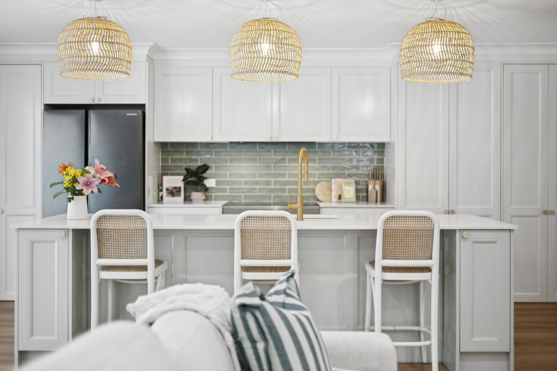 Step inside and be captivated by the warmth of timber look flooring, terrazzo finishes, brushed gold tapware, and a freestanding bath that rivals any boutique retreat. The gourmet kitchen is a standout - a chef's dream outfitted with premium appliances, plus a spacious walk-in butler's pantry - perfect for every day, entertaining or weekend feasts.